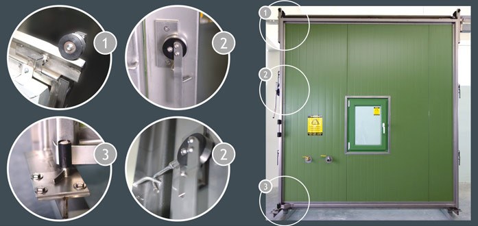 Dodatkowym elementem gwarantującym pełną szczelność drzwi są 4 mimośrody umieszczone na bokach płata drzwiowego. Po zamknięciu drzwi i dociśnięciu płata drzwiowego mimośrodami mamy pełną gwarancje szczelności nawet w przypadku wystąpienia różnicy ciśnień pomiędzy komorą a otoczeniem.